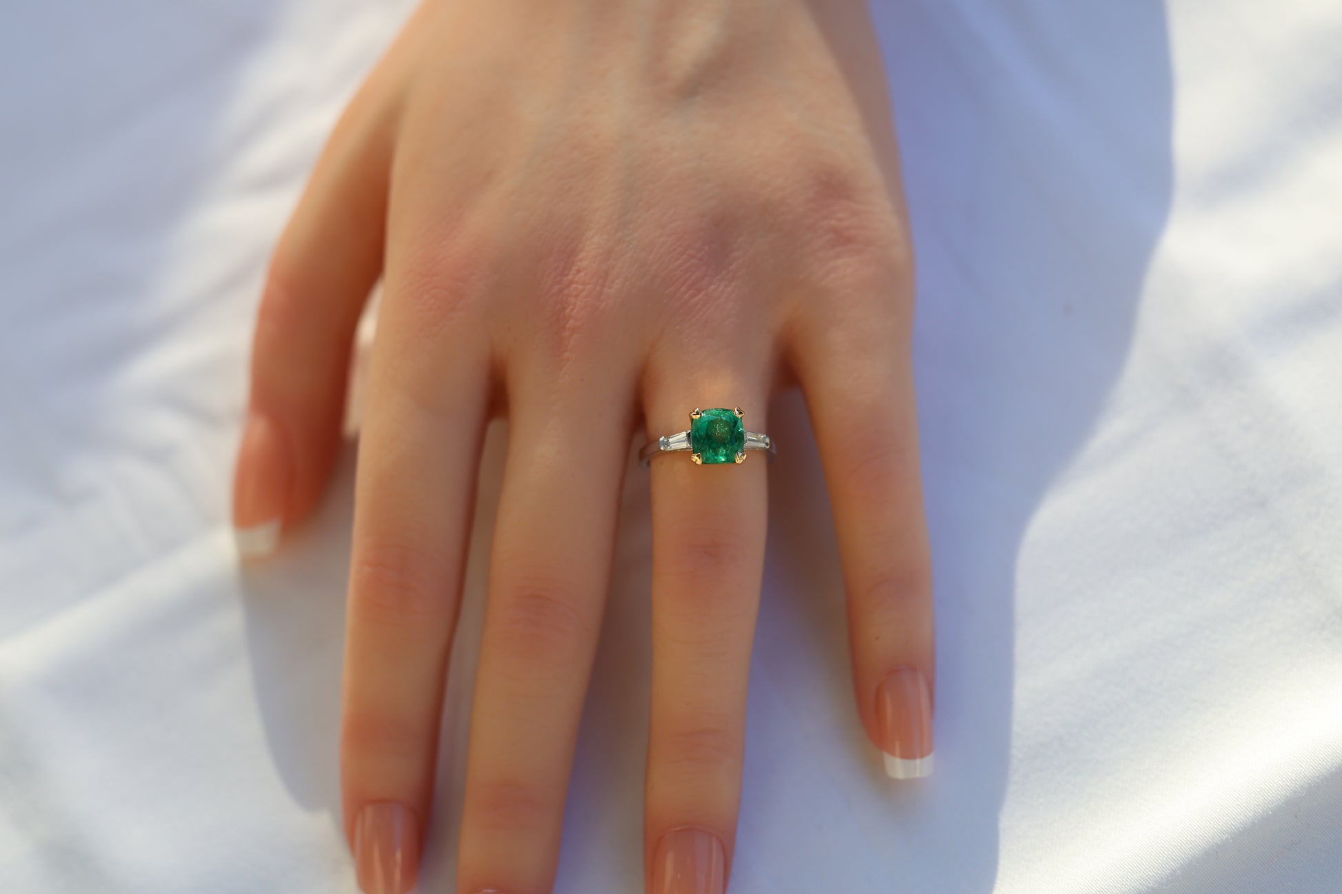 Dieses außergewöhnliche Schmuckstück besticht durch einen afghanischen Smaragd von hoher Farbqualität und lebhafter grüner Sättigung. Die geringfügige Ölbehandlung ist eine traditionelle und anerkannte Methode zur Verbesserung von Smaragden, die die natürliche Schönheit des Steins bewahrt. Die hochwertigen VVS-Baguette-Diamanten sorgen für einen eleganten Kontrast, während die zweifarbige Fassung aus 18 Karat Gold einen raffinierten Blickfang bildet.