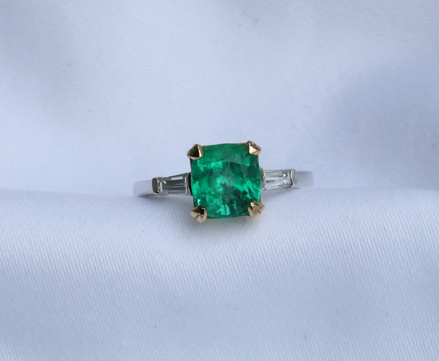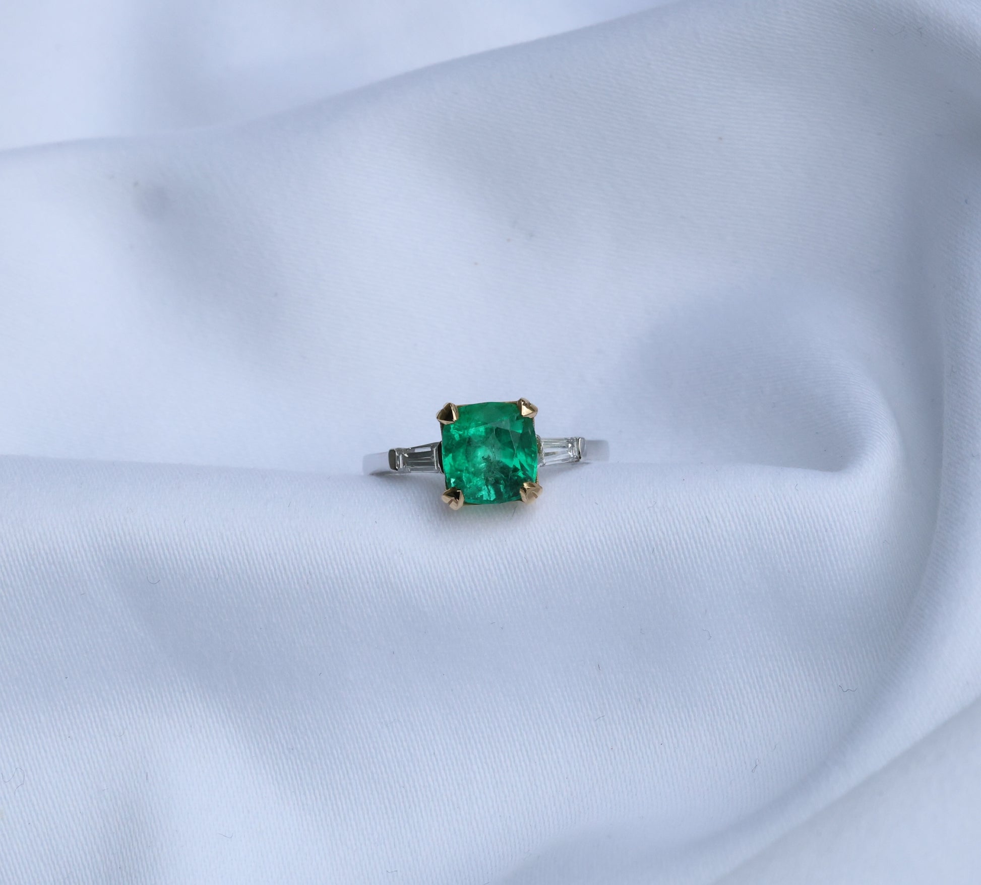Erleben Sie die außergewöhnliche Schönheit dieses atemberaubenden afghanischen Smaragdrings mit einem prächtigen Smaragd von 2.09 ct in feiner Farbqualität, gefasst in elegantem 18 Karat Weiß- und Gelbgold mit hochwertigen VVS-Baguette-Diamanten.