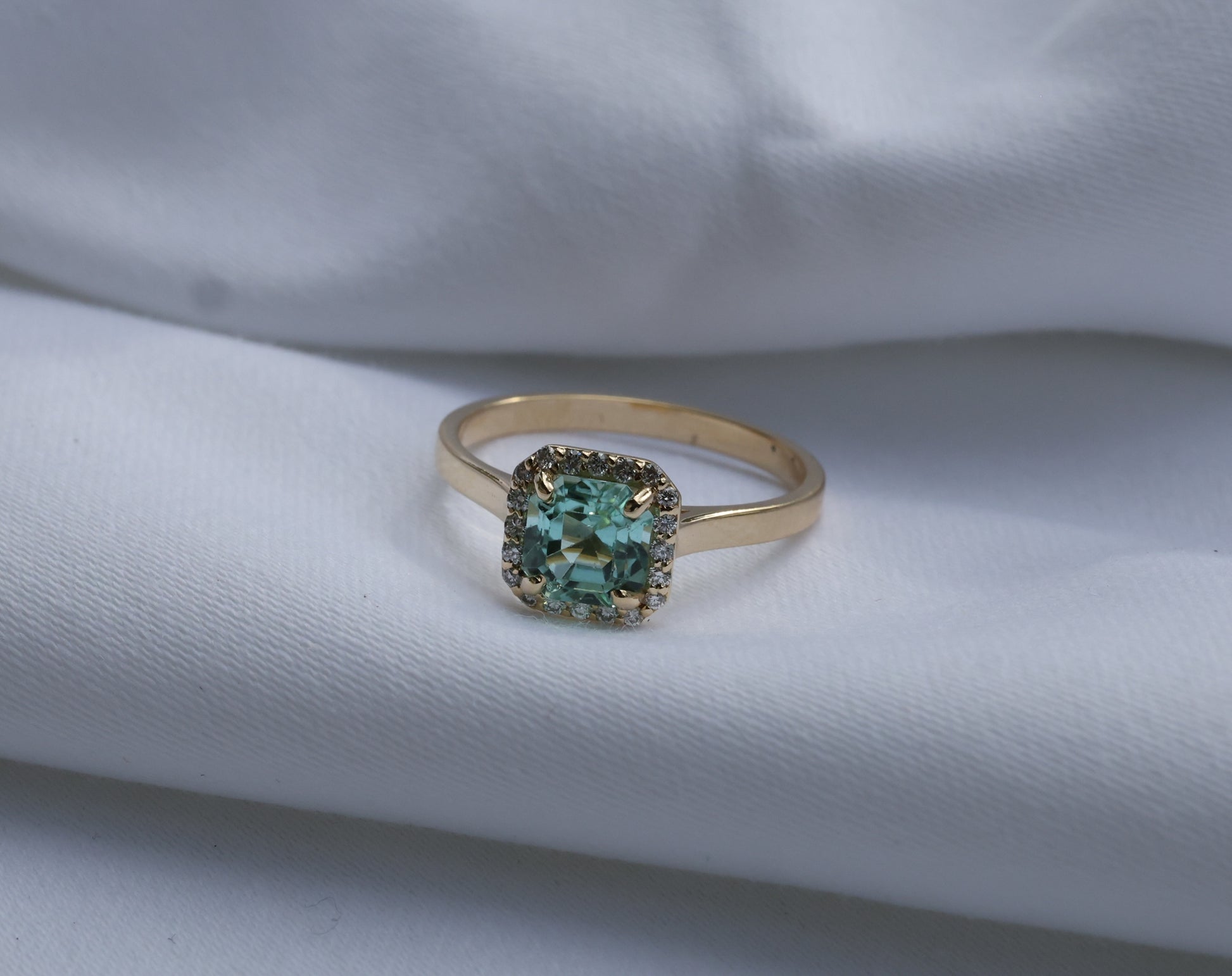 Erleben Sie die raffinierte Eleganz dieses Rings mit einem natürlichen blaugrünen Turmalin (Verdelith), der einen 1.64 ct schweren, quadratisch-achteckigen Edelstein im Stufenschliff präsentiert, der wunderschön von funkelnden Diamanten akzentuiert und in luxuriöses 14-karätiges Gelbgold gefasst ist.