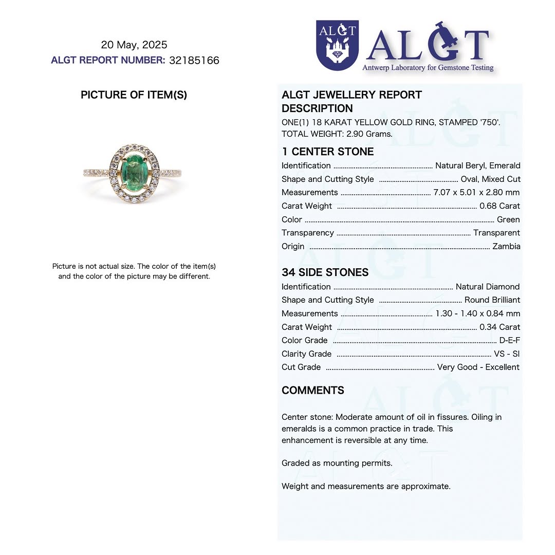 Erleben Sie die zeitlose Eleganz dieses atemberaubenden Rings mit einem natürlichen Smaragd aus Sambia umgeben von einem brillanten Diamantenkranz und einer Pavé-Fassung aus luxuriösem 18-karätigem Gelbgold.