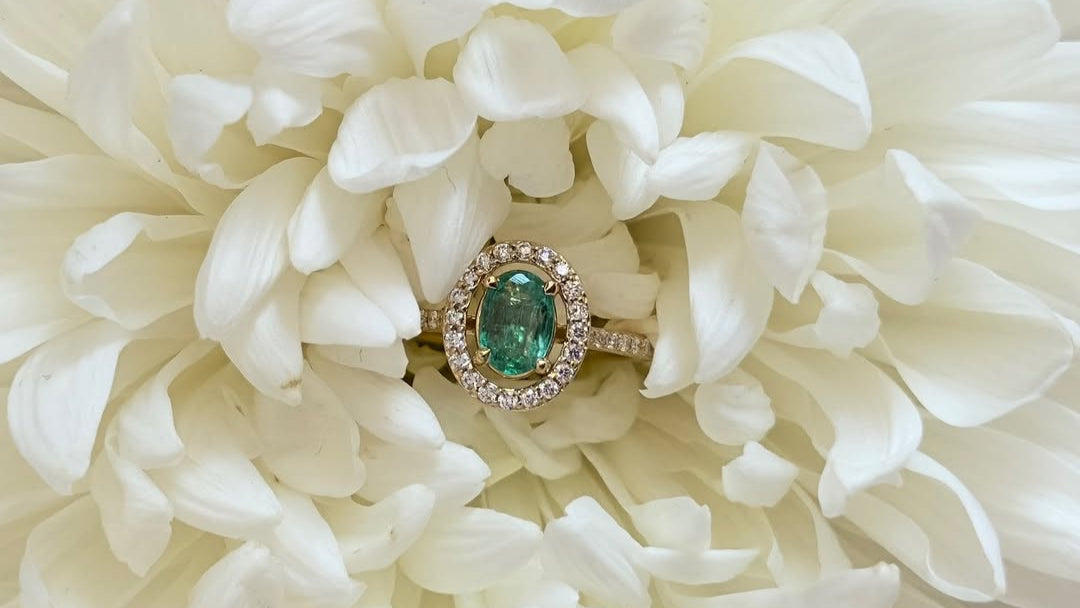 Dieses außergewöhnliche Schmuckstück besticht durch einen natürlichen Smaragd aus Sambia, der für seine wunderschöne grüne Farbe und Transparenz bekannt ist. Der Diamant-Halo und die Pavé-Fassung unterstreichen die natürliche Brillanz des Smaragds aus jedem Blickwinkel, während das 18 Karat Gelbgold für warme, klassische Eleganz sorgt.