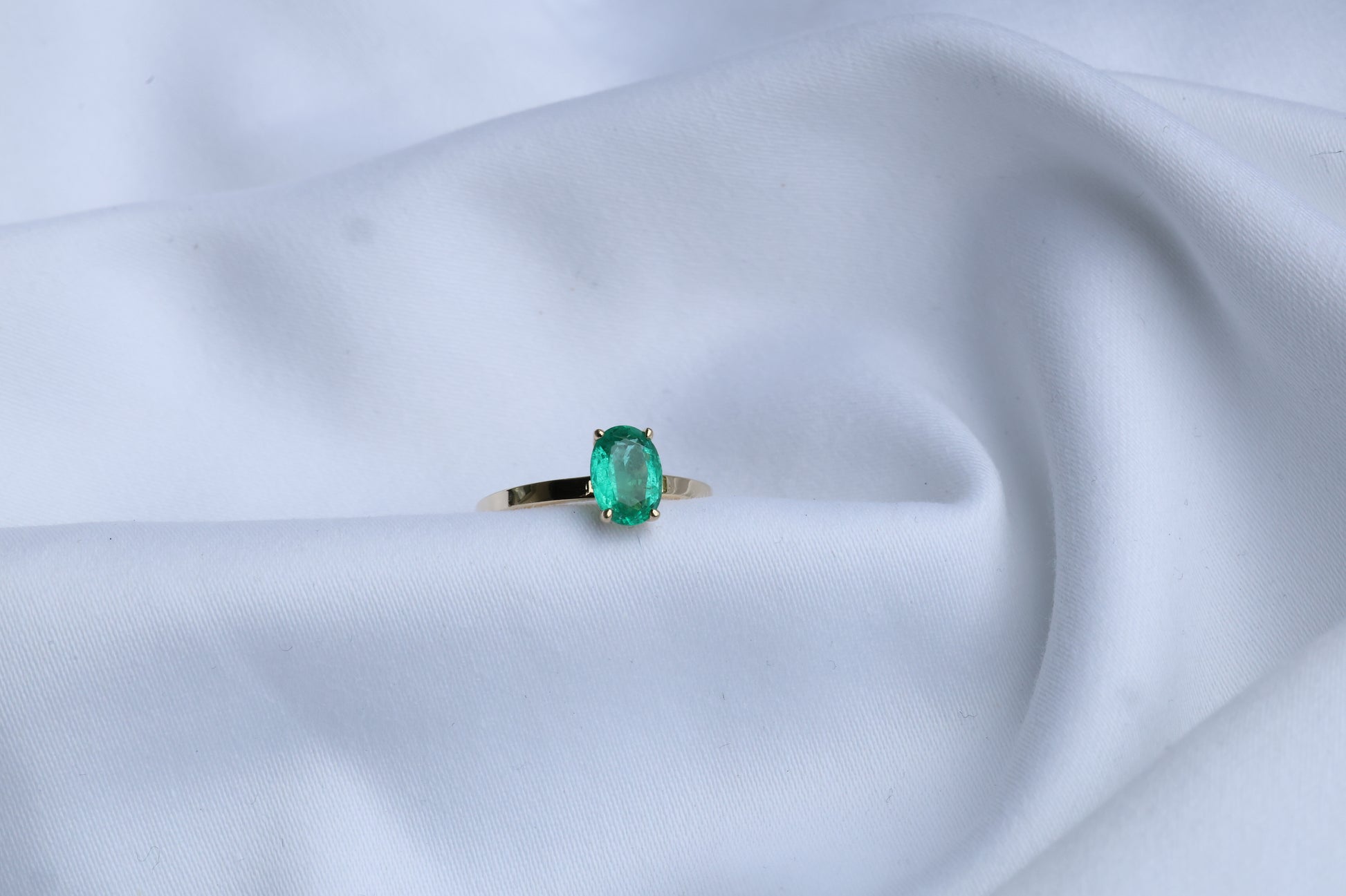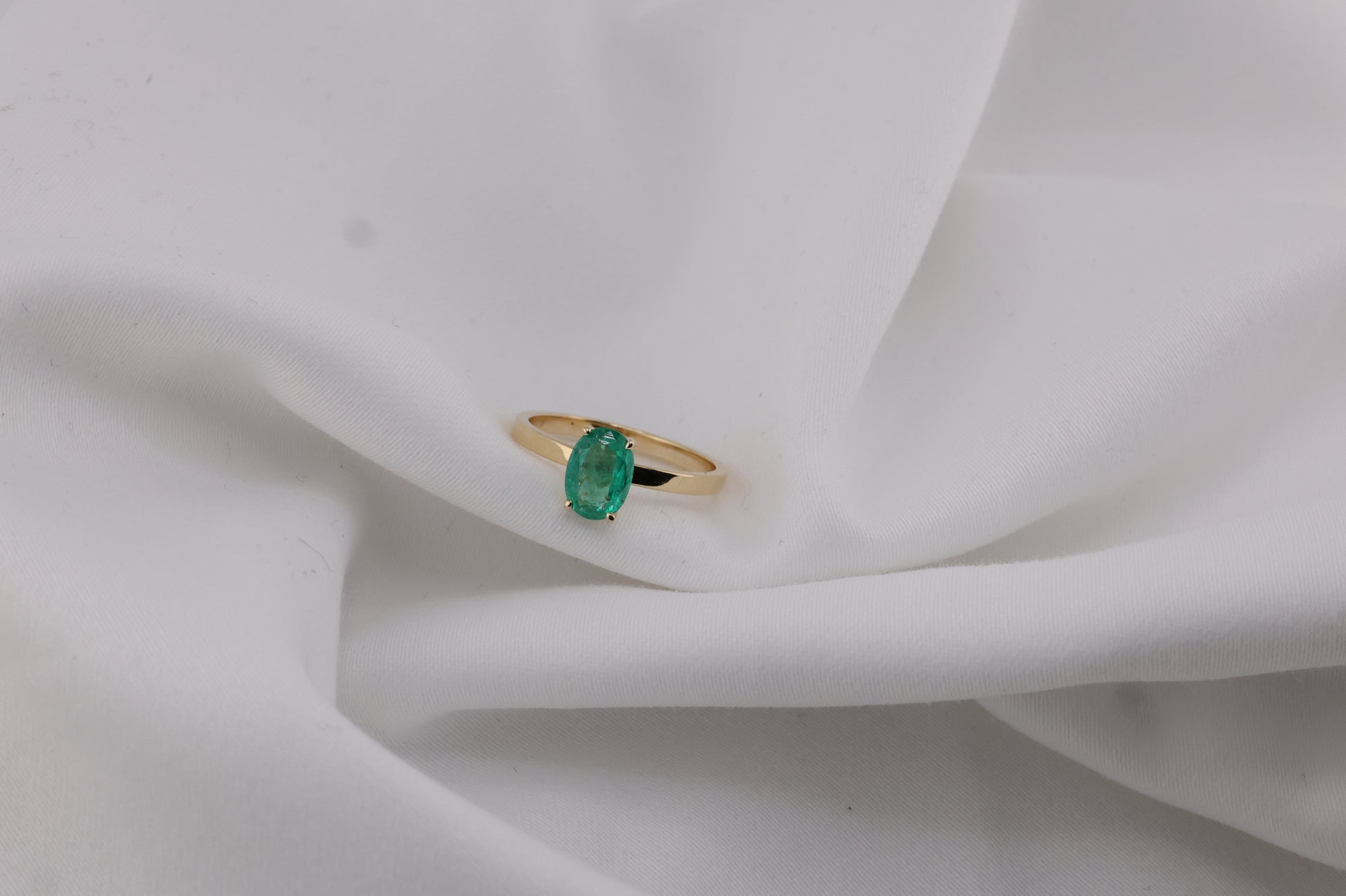 Erleben Sie die faszinierende Schönheit dieses luxuriösen Smaragd-Solitär Rings – ein Meisterwerk aus 14-karätigen Gelbgold, das den unvergleichlichen Reiz eines natürlichen Smaragds aus Sambia zur Geltung bringt.